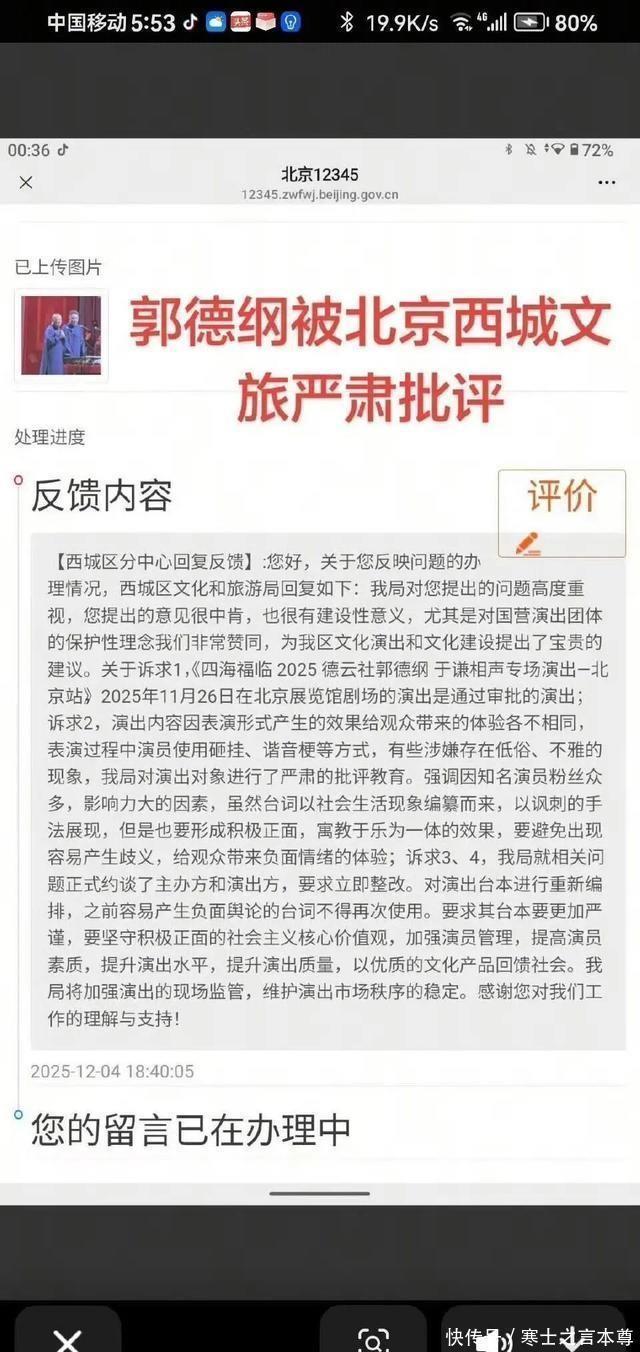 4天后,西城区分中心的回复截图流出,截图被网友标注“郭德纲被北京西城文旅严肃批评”的红字,官方反馈明确提到“表演过程中演员使用砸挂、谐音梗等方式,有些涉嫌存在低俗、不雅的现象,我局对演出对象进行了严肃的批评教育”,并透露已约谈主办方和演出方,要求立即整改、重新编排台本,禁用争议台词。随后,个人微信公众号“起社”的文章进一步放大消息,称“北京市西城区文旅局已于12月5日正式约谈德云社”,认定作品存在“低俗内容和不当影射国有院团行为”,让事件彻底发酵。